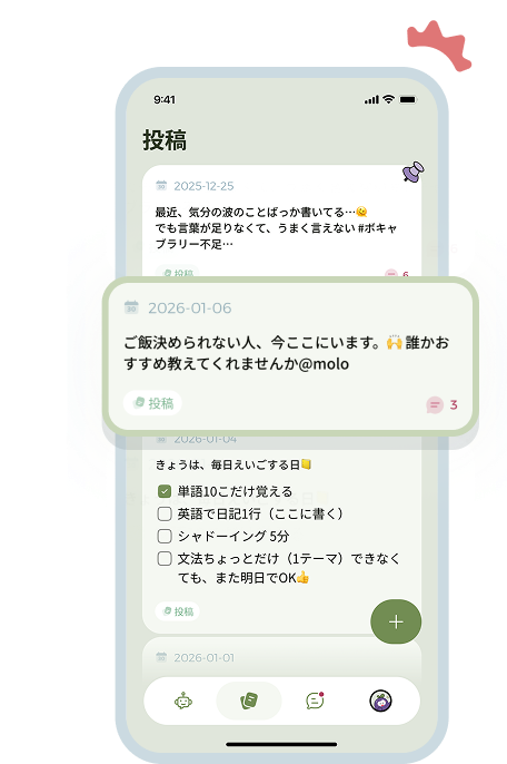 プライベート日記 - SNSのような気疲れは不要。誰かに見られる心配なく、気持ちを吐き出せます。記録を読むのは、あなたとAI パートナーだけ。